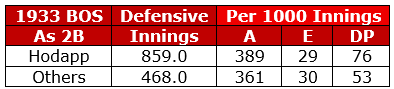 If you read the press assessments of Johnny Hodapp’s defensive skills, no matter what position he played, they tended to be harsher than what he probably deserved. It may be the syndrome that the better hitter you are, the more likely it is your defense is going to be knocked. He certainly wasn’t Gold Glove caliber, but my impression going through his career is that he was a very capable major league infielder, and that was true right through his last season, when the evidence leaned toward his being better than the other guys that Boston put out there — many of whom the press thought were better fielders than Hodapp.