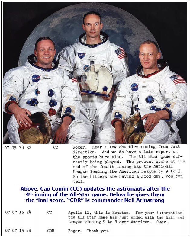 Not long after leaving lunar orbit, the astronauts were dutifully informed how, “Last night in New York, the Baseball Writers Association of America named Babe Ruth the greatest ball player of all time. Joe DiMaggio was named the greatest living ball player.” And they were disappointed along with the millions of baseball fans on earth when the All-Star game was rained out on July 22nd and had to be played the next night.